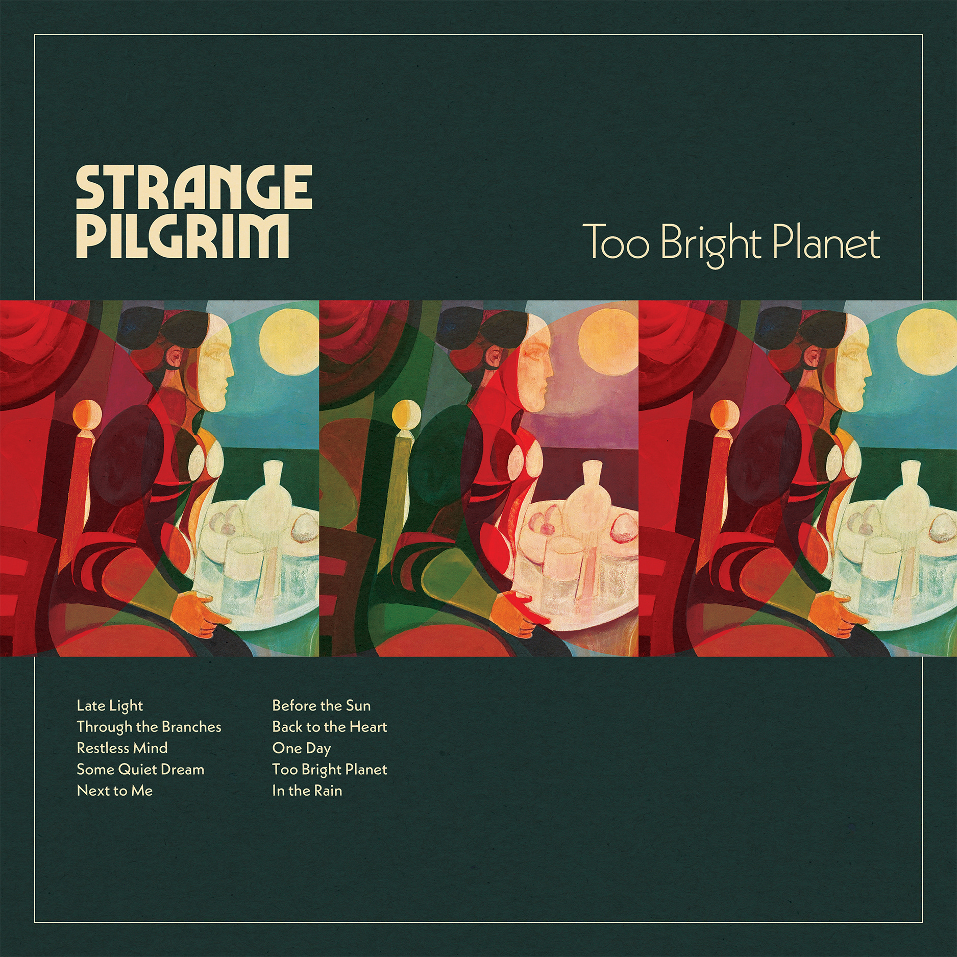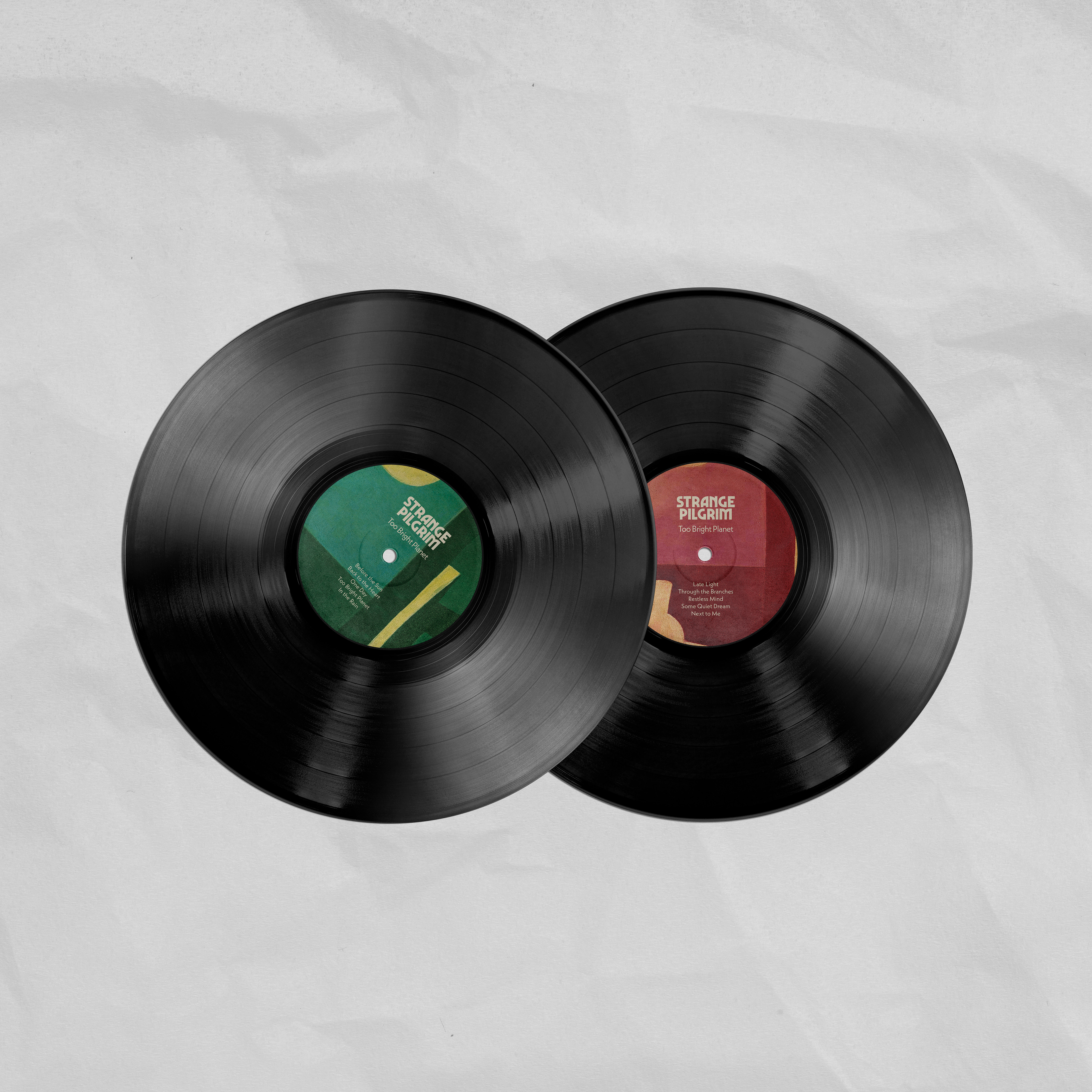 LP design for Strange Pilgrim's Too Bright Planet. Deliverables include front and back covers, front and back of insert, and vinyl labels.